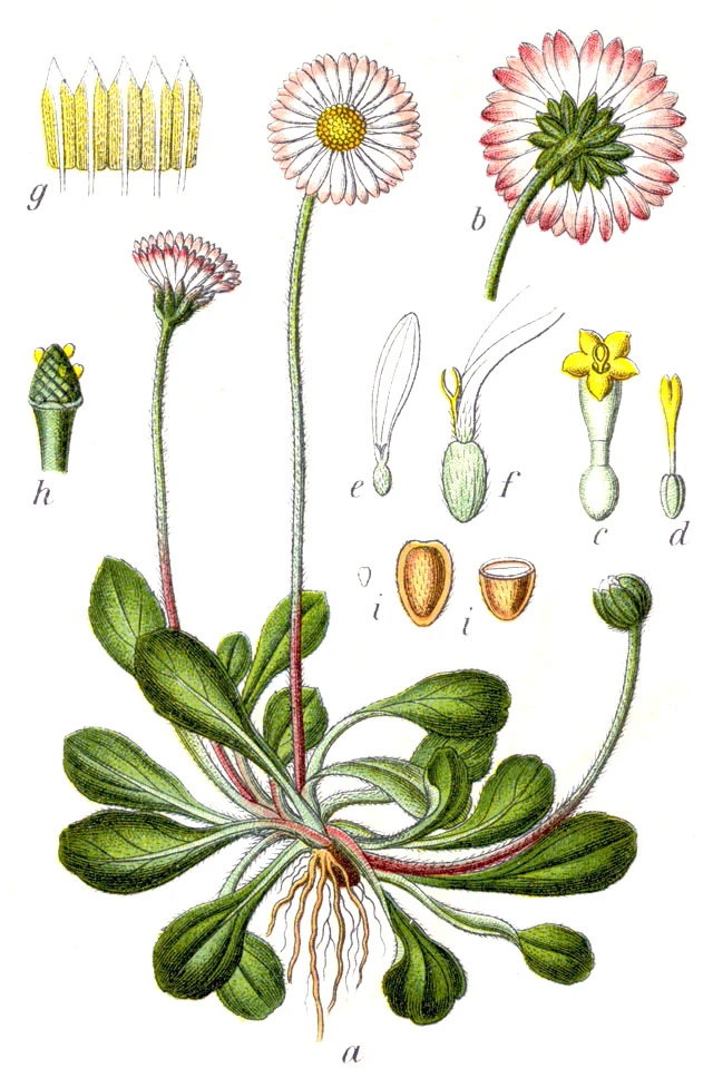 Plante aux capitules composés de pétales blanches autour d’un centre jaune. Contrairement à la marguerite, le dessous des pétales blanches de la pâquerette tirent vers le rose, et elle n’a pas de feuilles sur la tige.